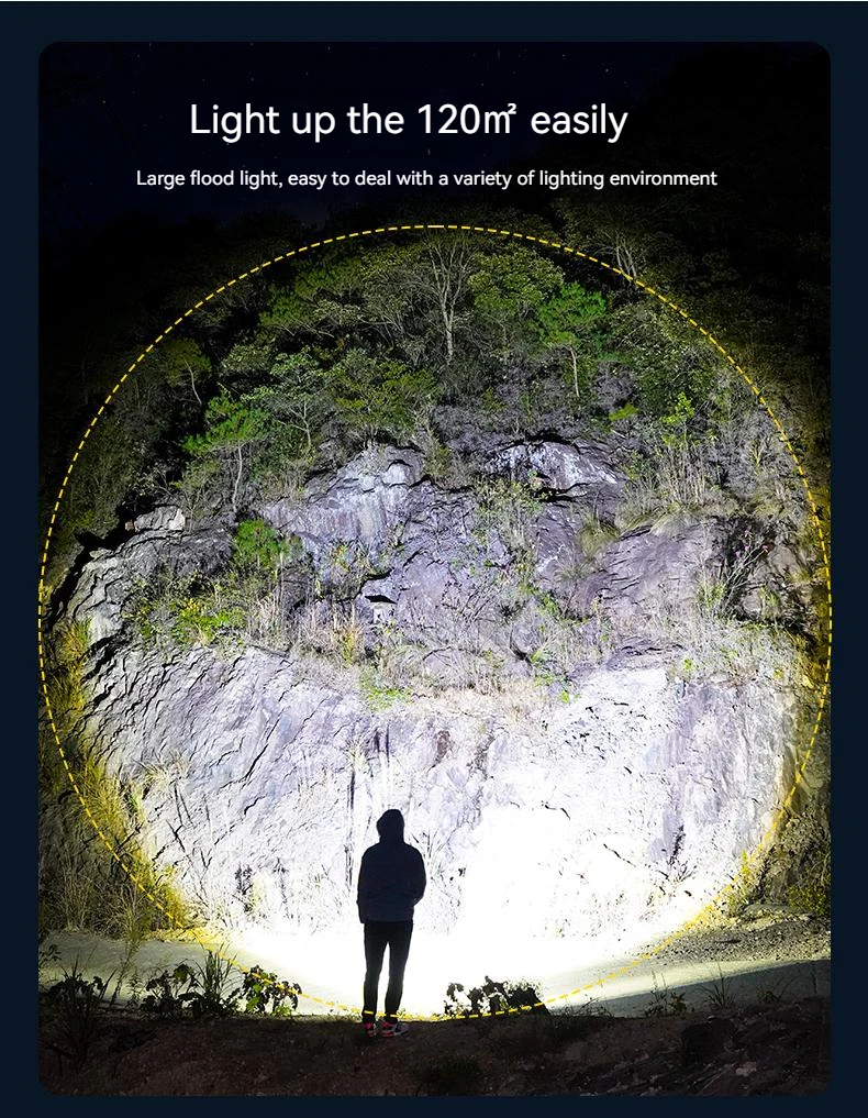 The beam can reach distances up to 100 meters, making it a reliable tool for night navigation, tent-area lighting, or safety-focused uses.